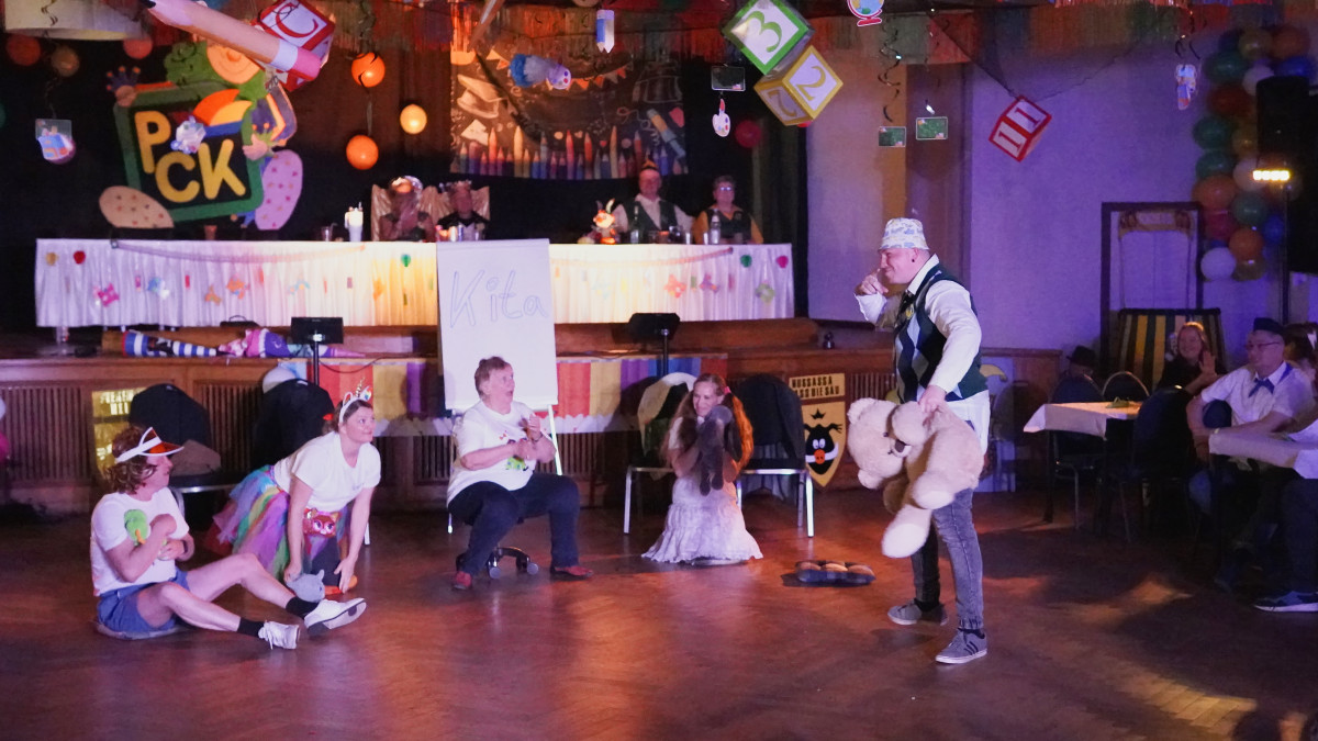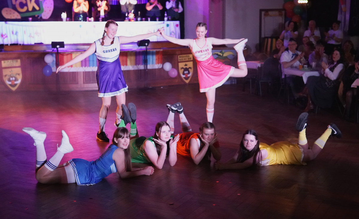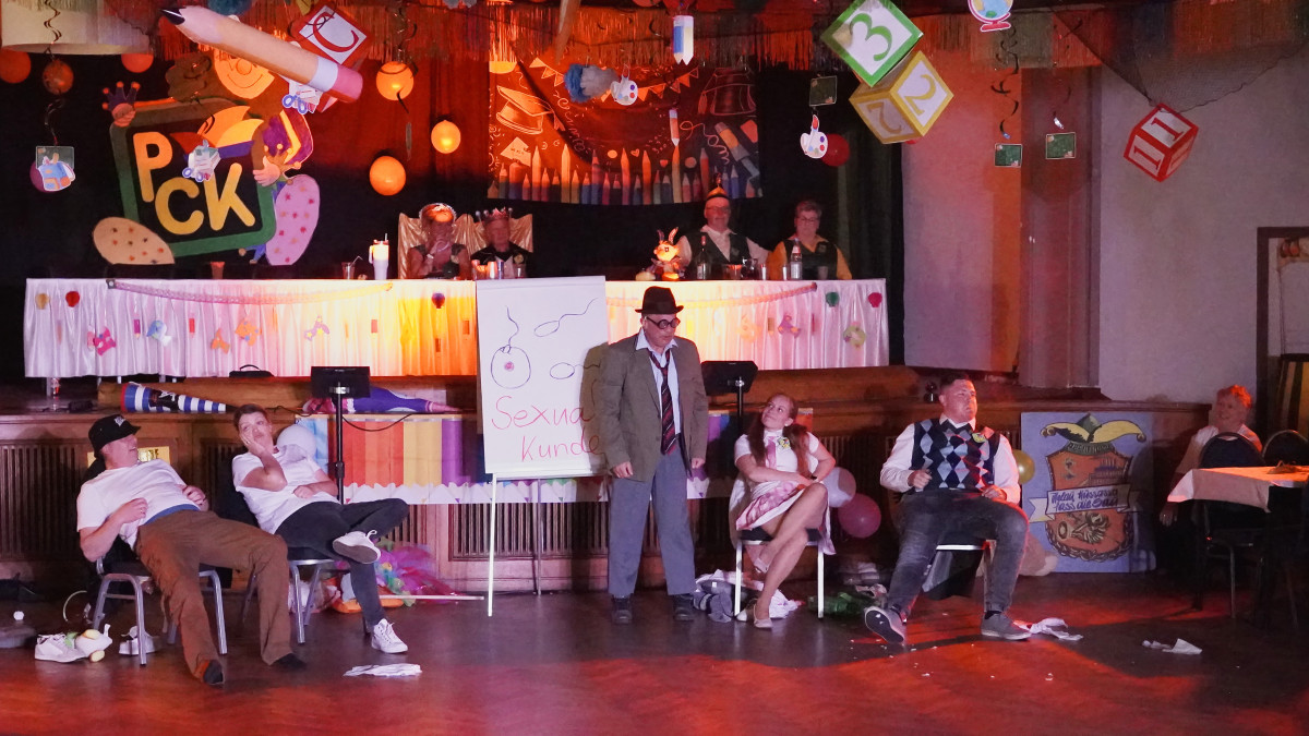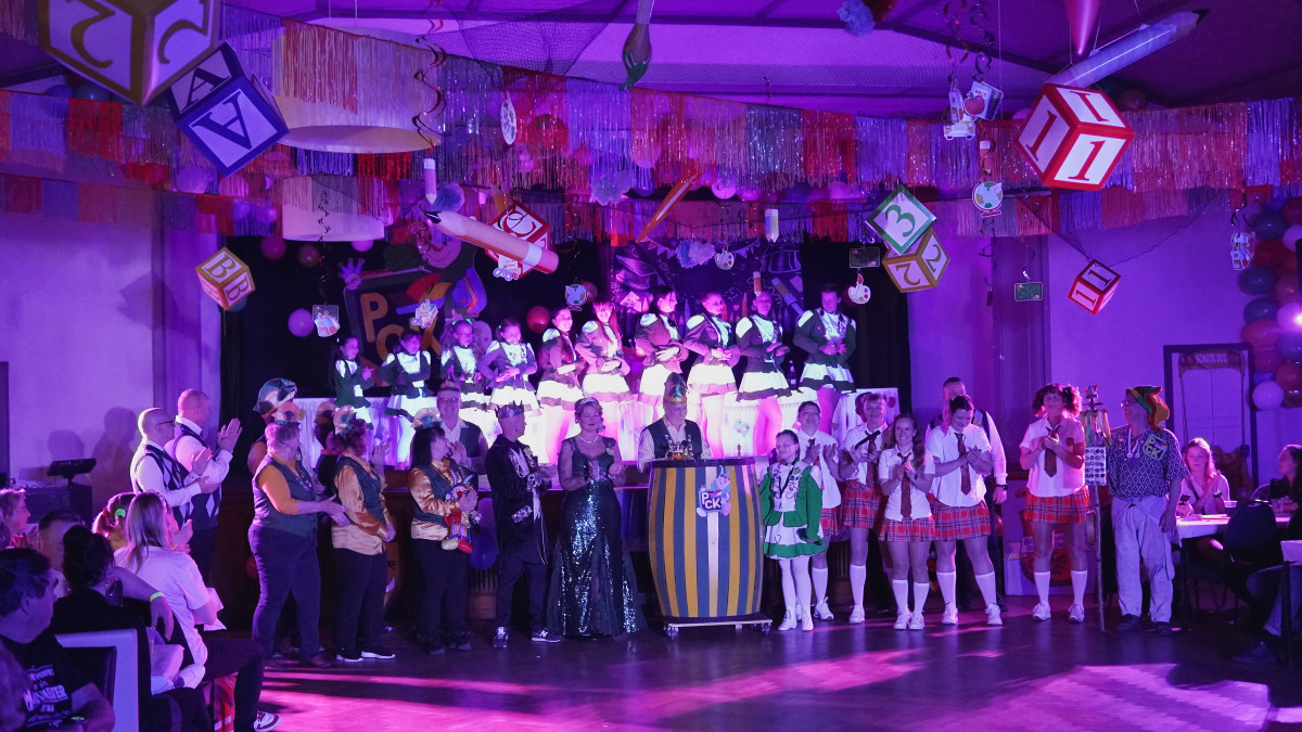 Nachdem alle einmarschiert waren und vor der Bühne Aufstellung genommen hatten, gaben sich Emma Szostak und Präsi Peter Günther zur Begrüßung der Gäste mal wieder ein kurzes Rede-Duell. Dem Thema entsprechend wurde der Elferrat als „Lehrerkollegium“ und das Gefolge als „Elternbeirat“ vorgestellt. Die Funken krakelten anstatt des Schlachtrufes lautstark als „frechste Klasse aller Zeiten“. Noch während des Eröffnungstanzes durch das Prinzenpaar, Nancy und Mücke, füllte sich die Tanzfläche. Die Party war gestartet.